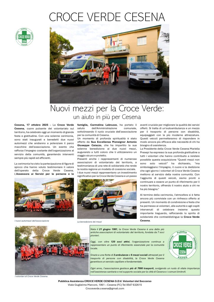 Oggi, 17 ottobre 2025, è un giorno che ci riempie di orgoglio e gratitudine! La nostra Croce Verde Cesena ha celebrato l’inaugurazione e la solenne benedizione di due nuovi automezzi vitali: una fiammante autoambulanza e un moderno mezzo attrezzato per il trasporto di persone con disabilità! 🚑